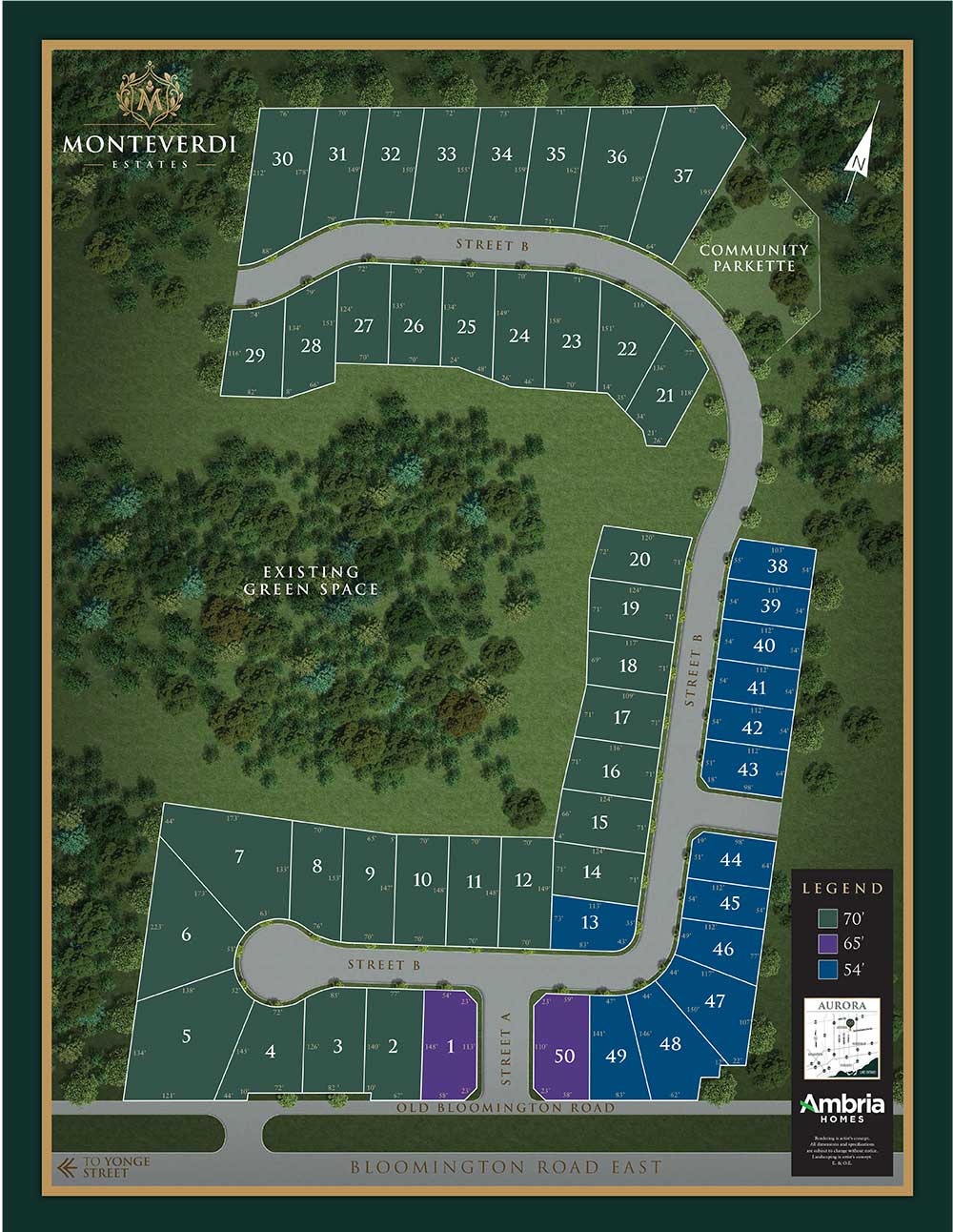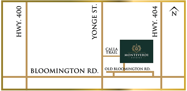 At Bloomington Road and Yonge Street, Monteverdi is a private enclave of exquisite Bungalow and Two-Storey Estates on lush 54′ & 70′ lots. Beyond the main entryway, there are top rated public and private schools, art galleries, libraries, boutiques and the finest international cuisine. Reconnect with nature with unparalleled access to the best parks, ponds and trails right outside your door. Connect easily to Aurora’s historic downtown, Highways 404 and 407, VIVA and GO Transit to get around the GTA and downtown Toronto in minutes.